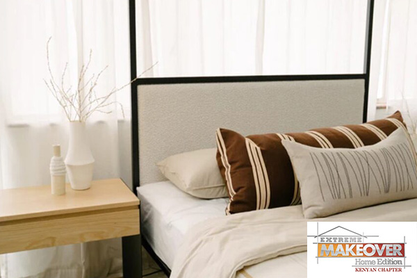 Sleep like royalty in this modern four-poster bed. Clean lines paired with an upholstered headboard make this design striking and comfortable at the same time.